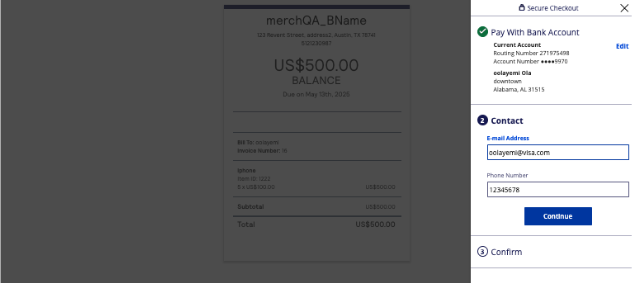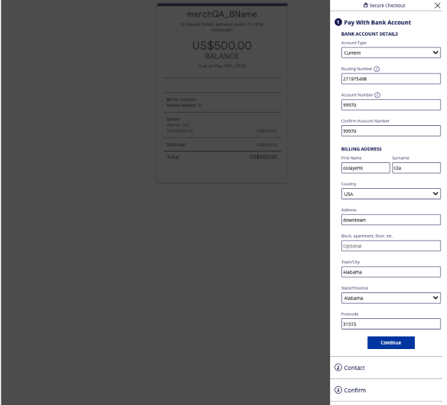2. When the customer clicks the link, a sidebar appears. In the sidebar, the customer enters information about their bank account and billing address and clicks