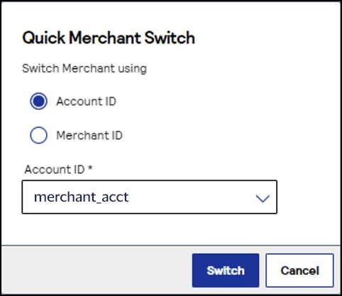 The Quick Merchant Switch window appears.Choose the merchant account ID that you want to switch to. ClickSwitchwhen done.