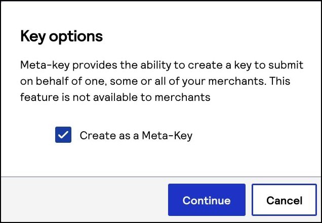 - If you are using a merchant account, see Merchant Account User: Create a Meta Key.