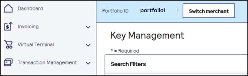 - On the left navigation panel, choosePayment Configuration > Key Management.If you are using a portfolio account to create a meta key for one of your merchant accounts, you can switch to a merchant account by clickingSwitch merchant.