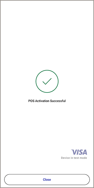 - After the certificates are retrieved by the POS system and the sync between your POS system and Android device is complete, thePOS Activation Successfulmessage appears. TapClose. The next set-up screen appears.
